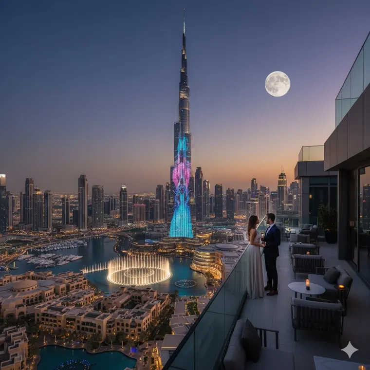 - Marvel at the Indoor Fountain : Watch the Burj Khalifa's distinctive indoor fountain shine with 6,000 dazzling lights, a magnificent sight to behold in the evening.