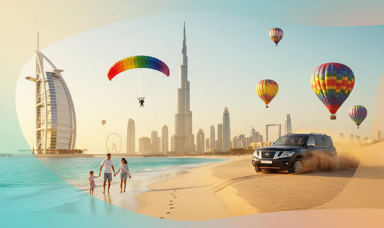 Adventure seekers can explore the Arabian Desert through desert safaris, dune bashing, camel rides, and hot air balloon tours. Visitors can also enjoy waterfront experiences at Dubai Marina, Jumeirah Beach, and Palm Jumeirah.